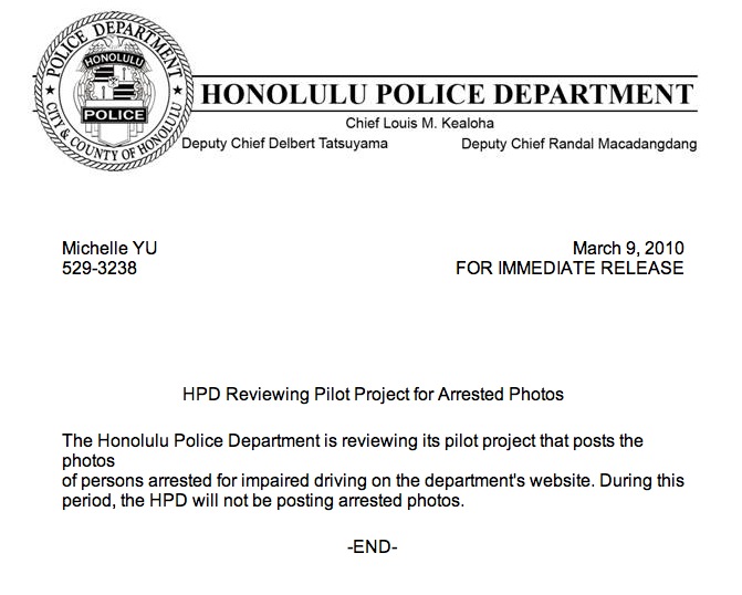Oh sadness, the Honolulu Police Department is discontinuing its online program of showcasing drunk driving suspects. Each Wednesday, the HPD would post mug shots of these law breakers and each week, there’d be a swarm of traffic to this site. Heck, there’s even a Facebook Fan Page for this.