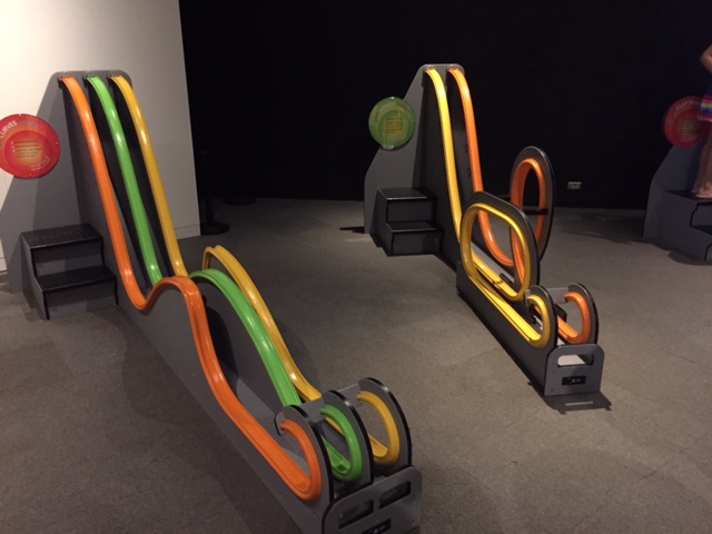 The inner displays focus on the science of the roller coasters, analyzing speed, height, curvature, angles, and more. Roll balls down the tracks to see the impact of the differences.