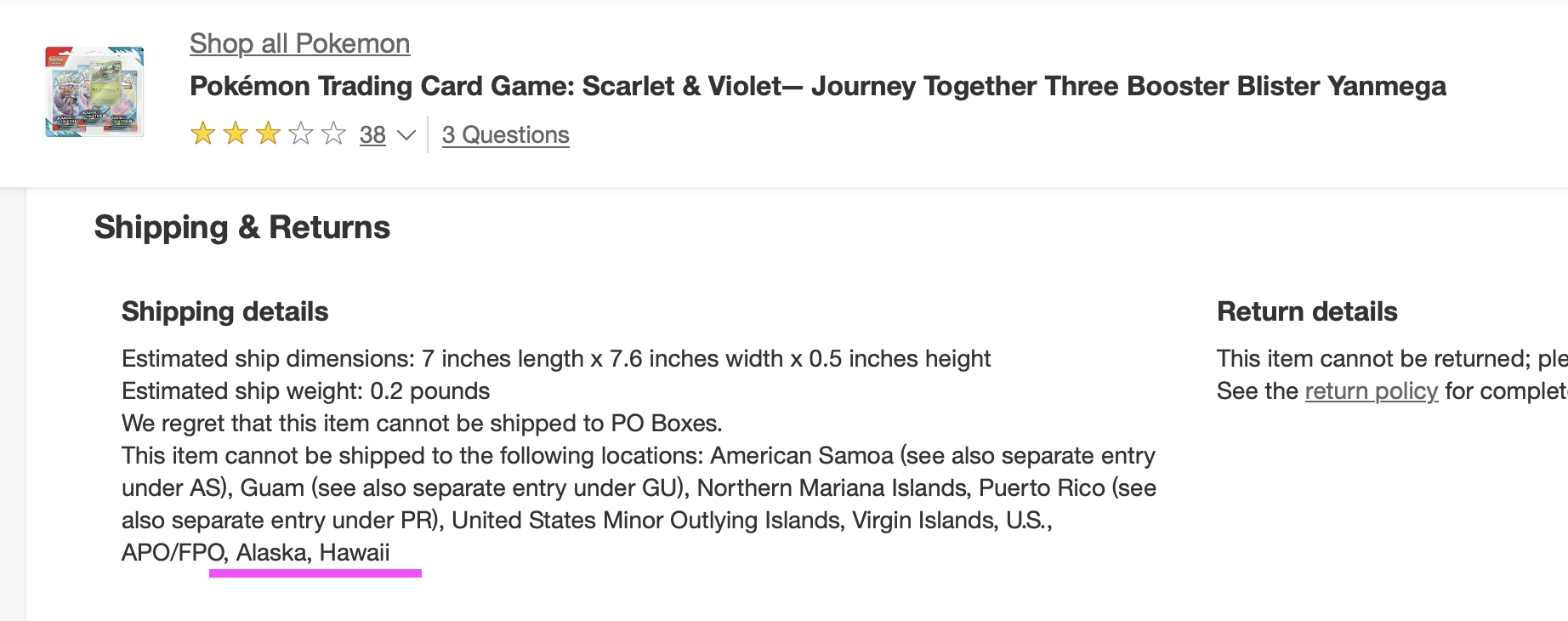 Not exactly sure when this happened, but apparently Target no longer ships Pokemon cards to Hawaii. If you check the product description like this one, you’ll see this blurb in the Shipping & Returns section.